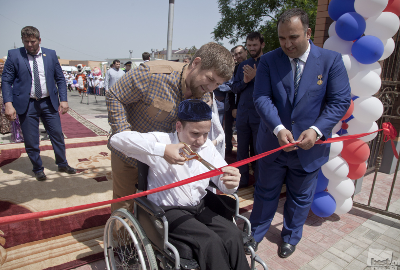 Глава Чеченской Республики и мальчик инвалид перерезают красную ленточку при торжественном открытии зоопарка, приуроченного ко Дню защиты детей 1 июня