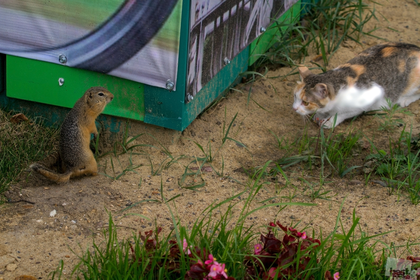 Суслик поселился под домиком, где бизнесмены хранят сдаваемые в прокат велосипеды. И, прирученная прокатчиками кошка, каждый день ловила шустрого постояльца. Остров Татышев, Красноярск