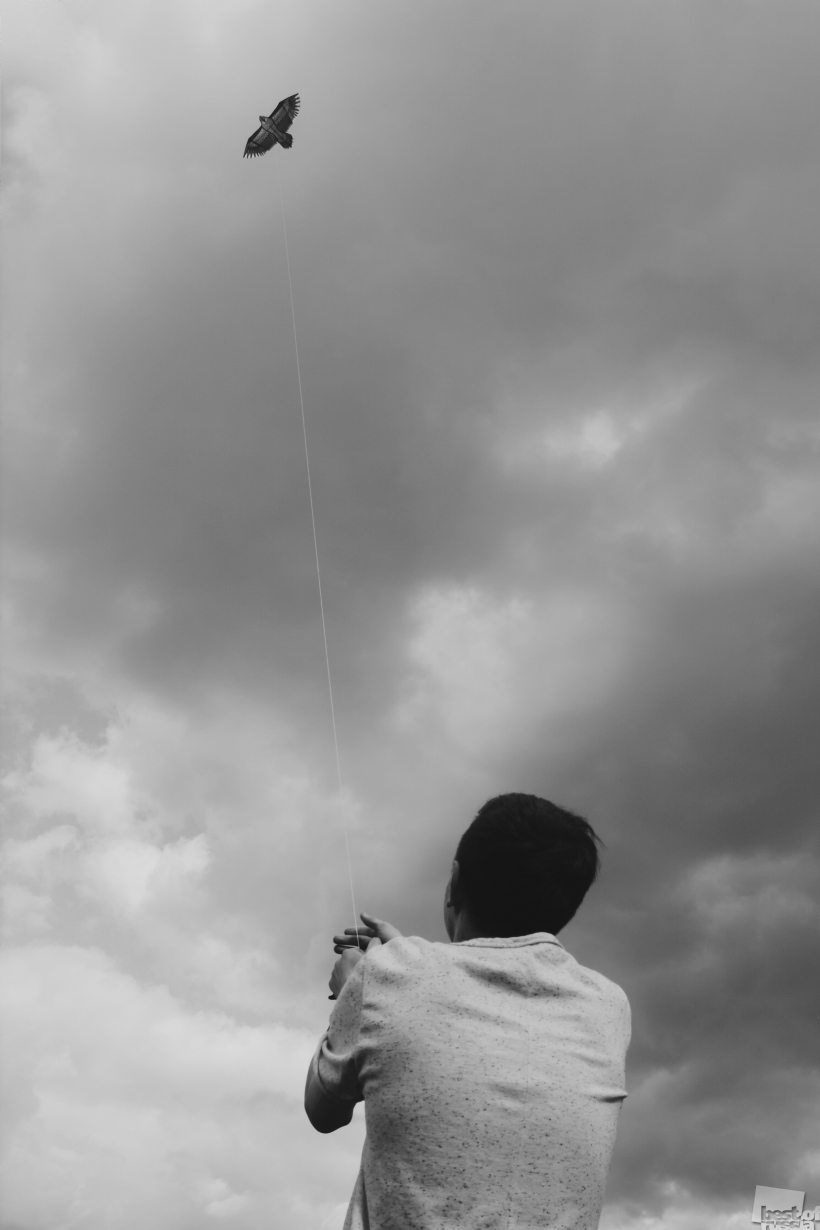 Парень стоял один, в стороне от толпы людей, как будто никого кроме него и воздушного змея не существовало вокруг. Видно было, что он наслаждался моментом и был поглощен полетом.